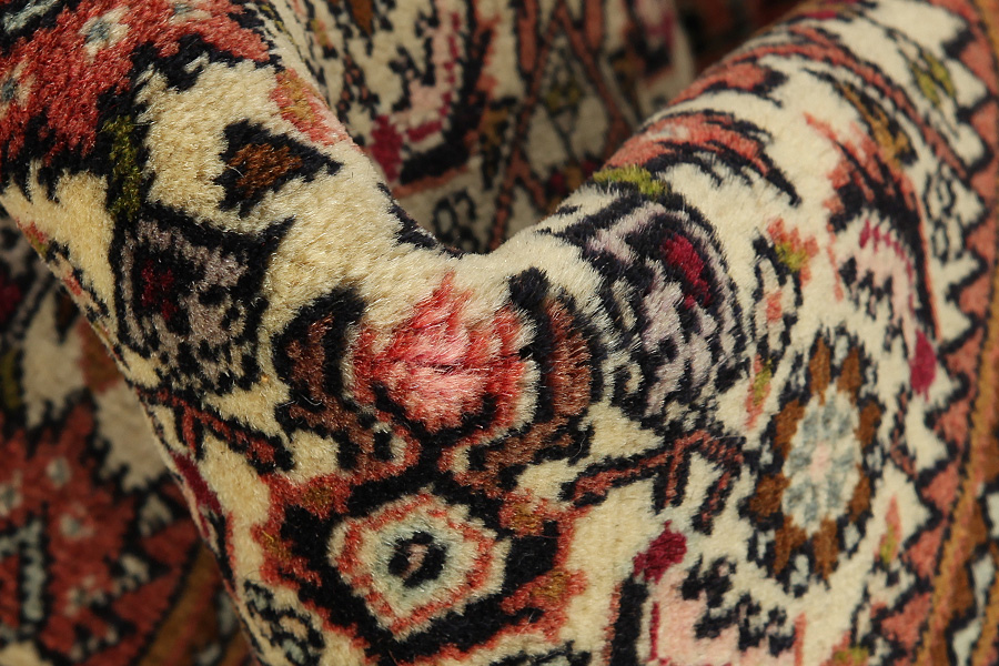 Abrasz: Ze względu na odmienny stopień natłuszczenia włosia oraz różnej zawartości soli podczas procesu barwienia, wełna wykazuje nierównomierną chłonność ilości barwnika. Przed rozpoczęciem tkania nie jest to aż tak widoczne. Natomiast podczas samego tkania powstają rzędy o odmiennych odcieniach tego samego koloru. Efekt ten zwany jest Abrasz – co w języku perskim znaczy „chmurka” - demonstruje ono naturalność i autentyczność włosia, do którego wyrobu nie zostały użyte żadne środki chemiczne. Przykłady