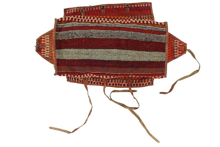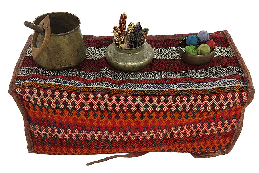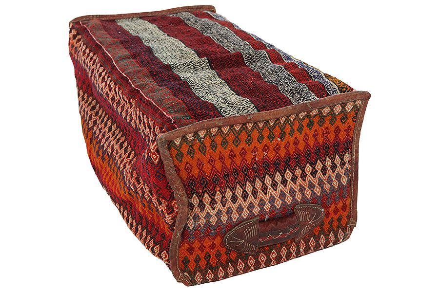 Bedding Bags:  Zazwyczaj części były tkane na krośnie za pomocą techniki zwanej sumak, z różnymi wzorami tworzonymi po bokach, a także na tkanym dnie.Czasami wełniane pętle były wszywane na górze torby, aby można je było przymocować do wielbłądów za pomocą pasków. Gdy koczownicy, którzy korzystali z toreb, mieszkali w swoich namiotach, pościel w torbach można było usunąć, a torbę zawieszono na ścianach namiotu.